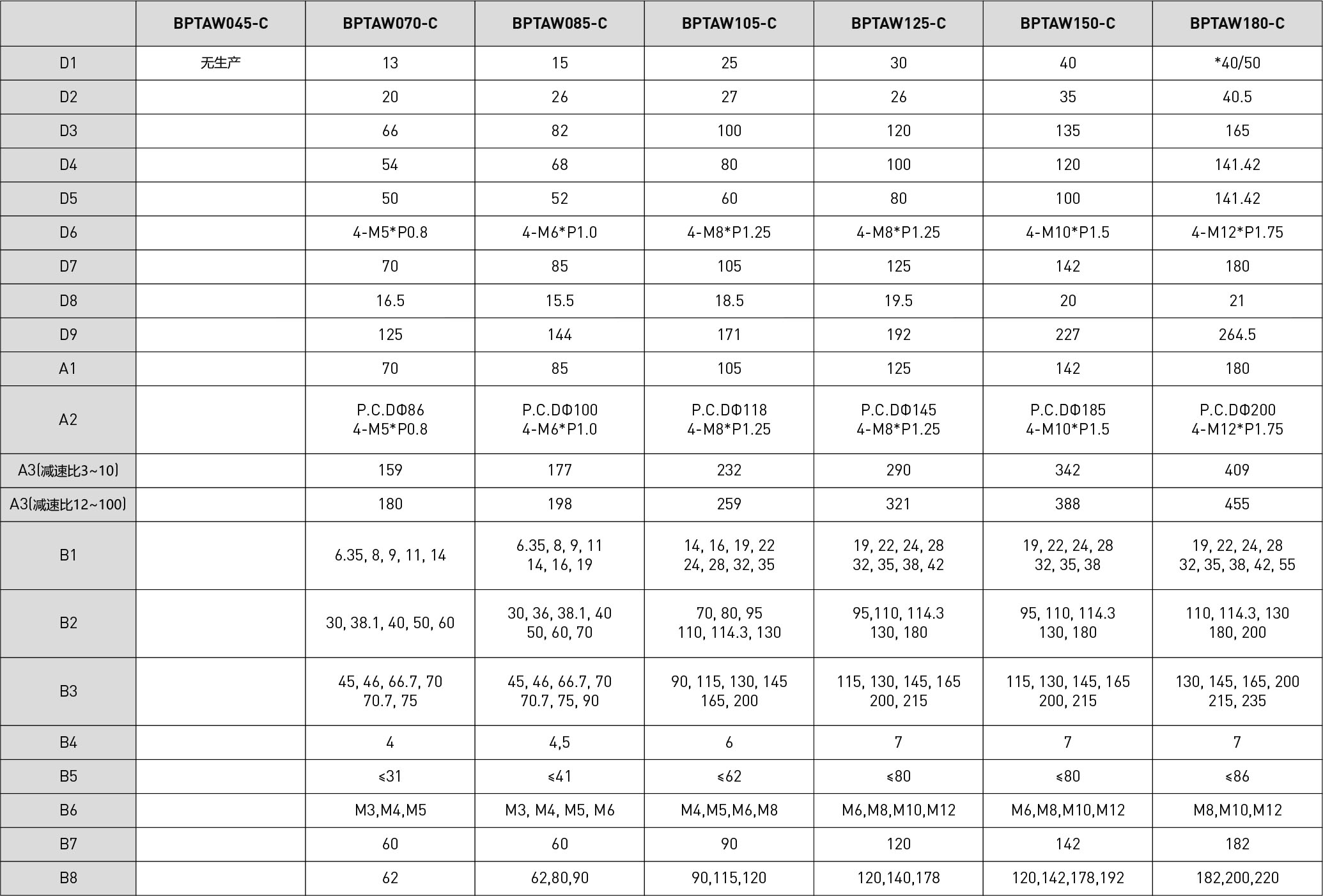 | 技術(shù)參數(shù) | 單位 | 減速比 | BPTAW045 | BPTAW070 | BPTAW085 | BPTAW105 | BPTAW125 | BPTAW150 | BPTAW180 |