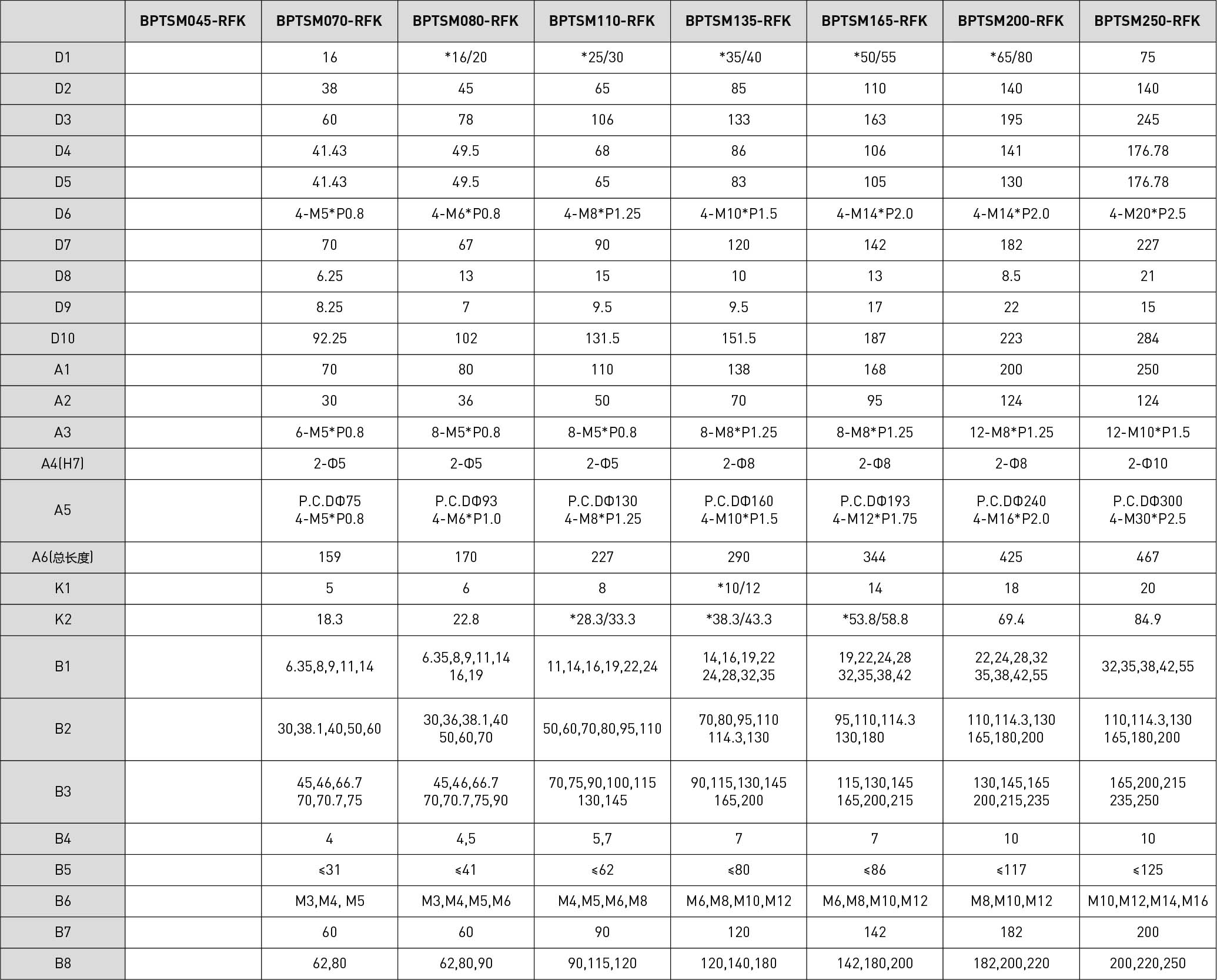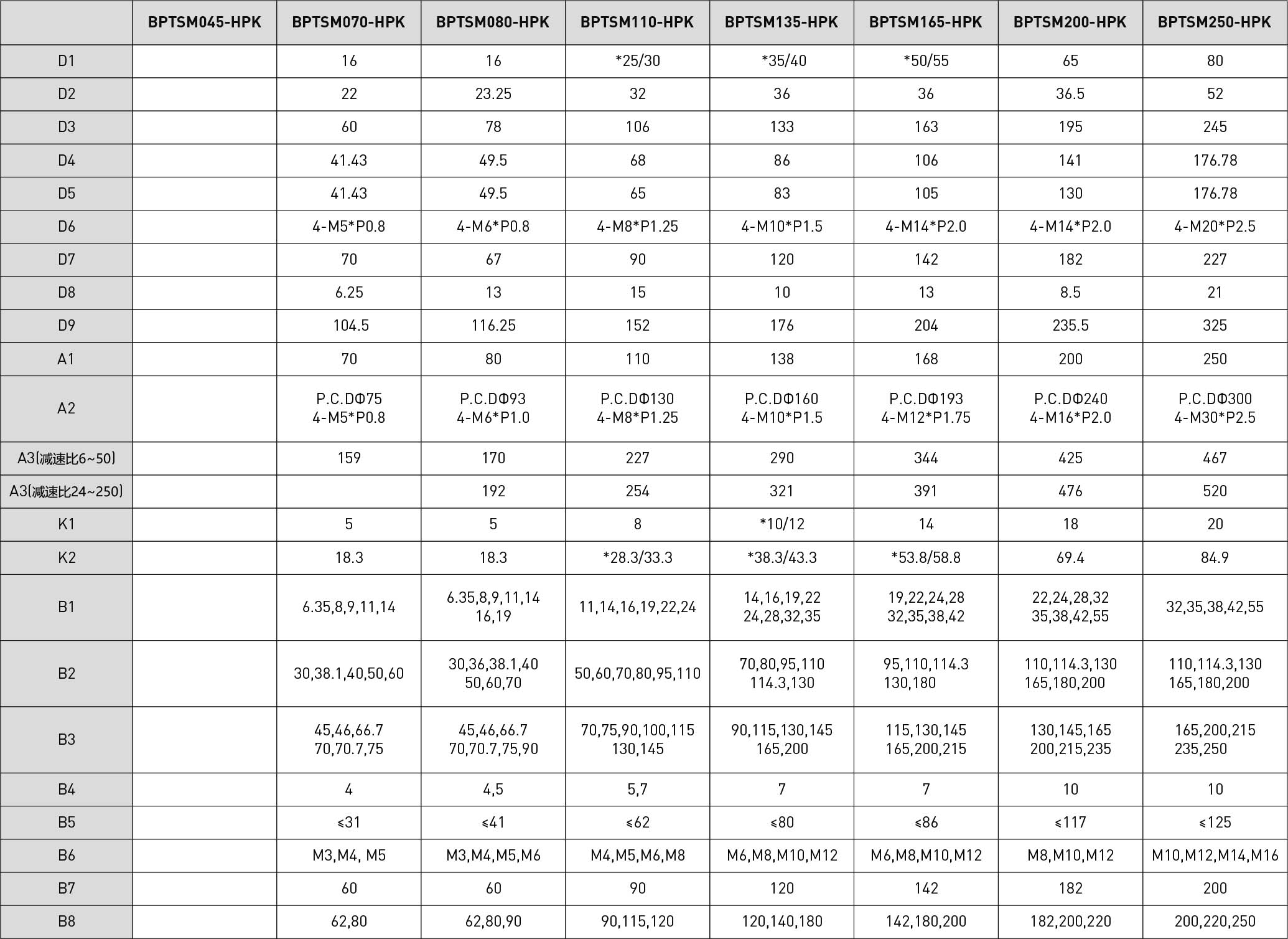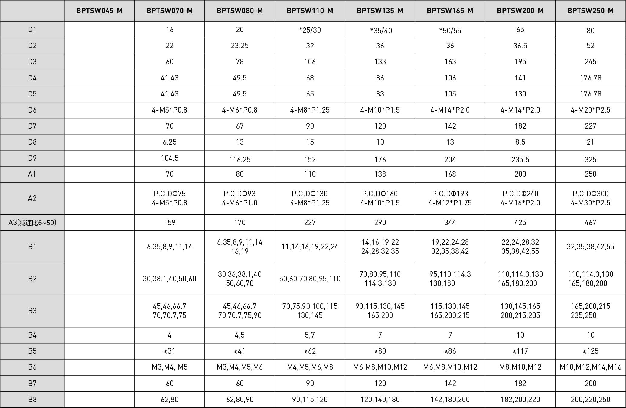 | 技術(shù)參數(shù) | 單位 | 減速比 | BPTSM045 | BPTSM070 | BPTSM080 | BPTSM110 | BPTSM135 | BPTSM165 | BPTSM200 | BPTSM250 |