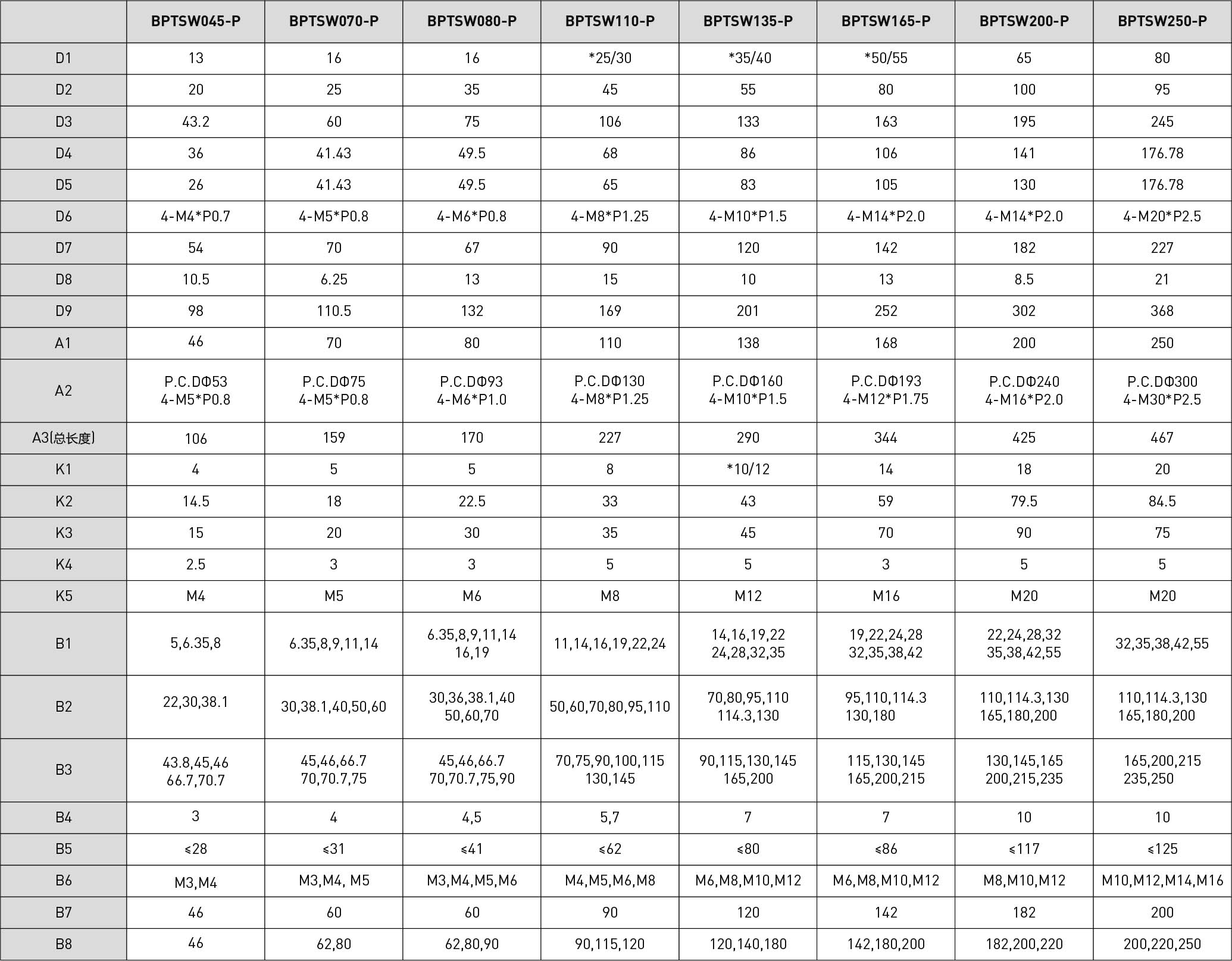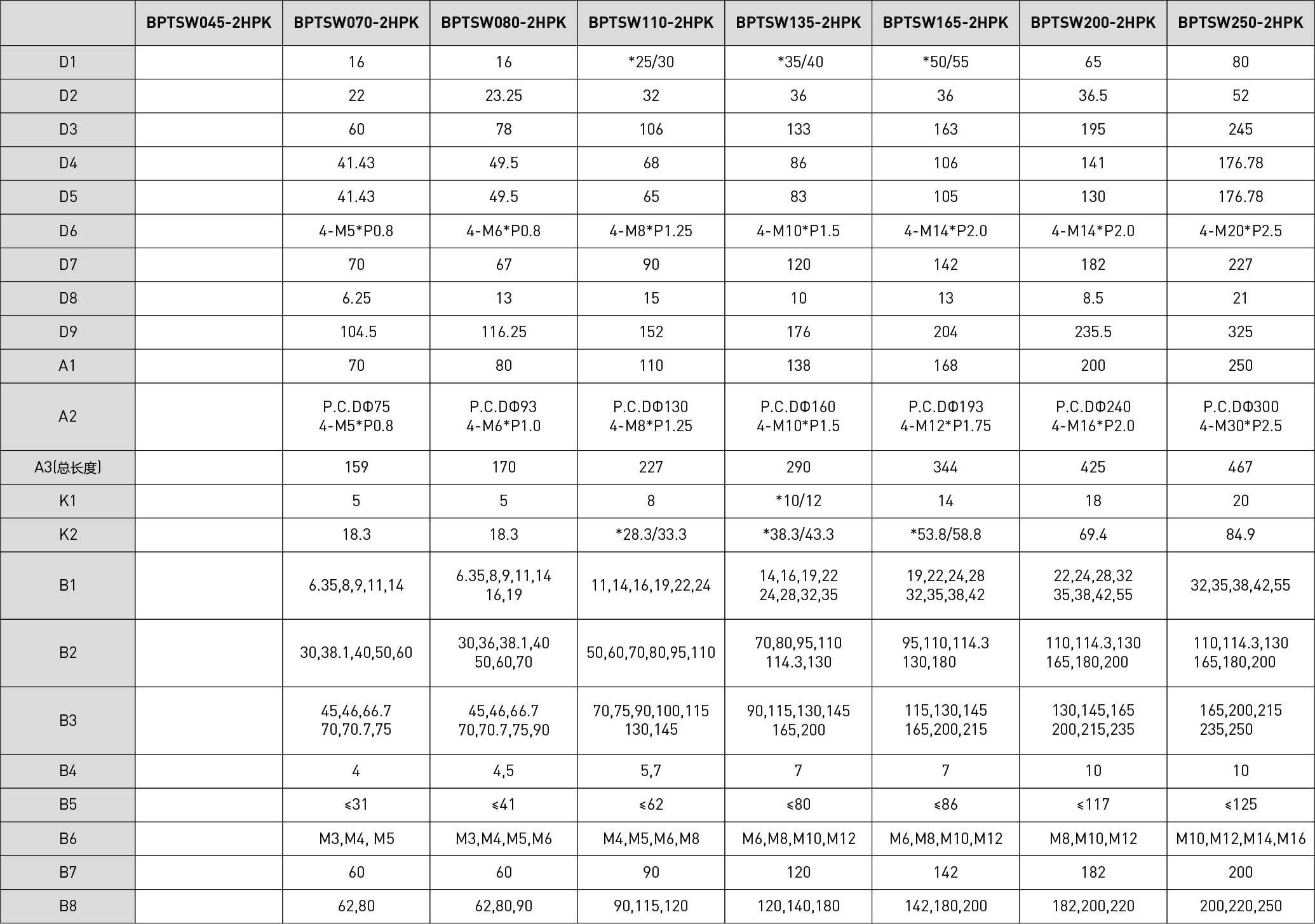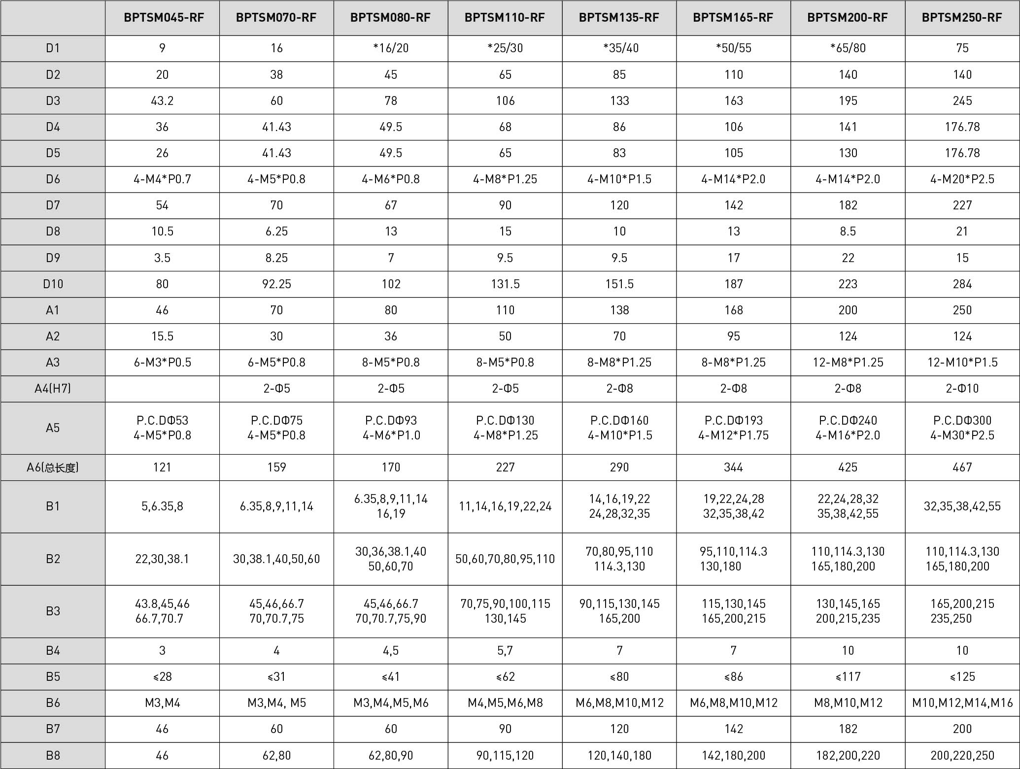 | 技術(shù)參數(shù) | 單位 | 減速比 | BPTSM045 | BPTSM070 | BPTSM080 | BPTSM110 | BPTSM135 | BPTSM165 | BPTSM200 | BPTSM250 |